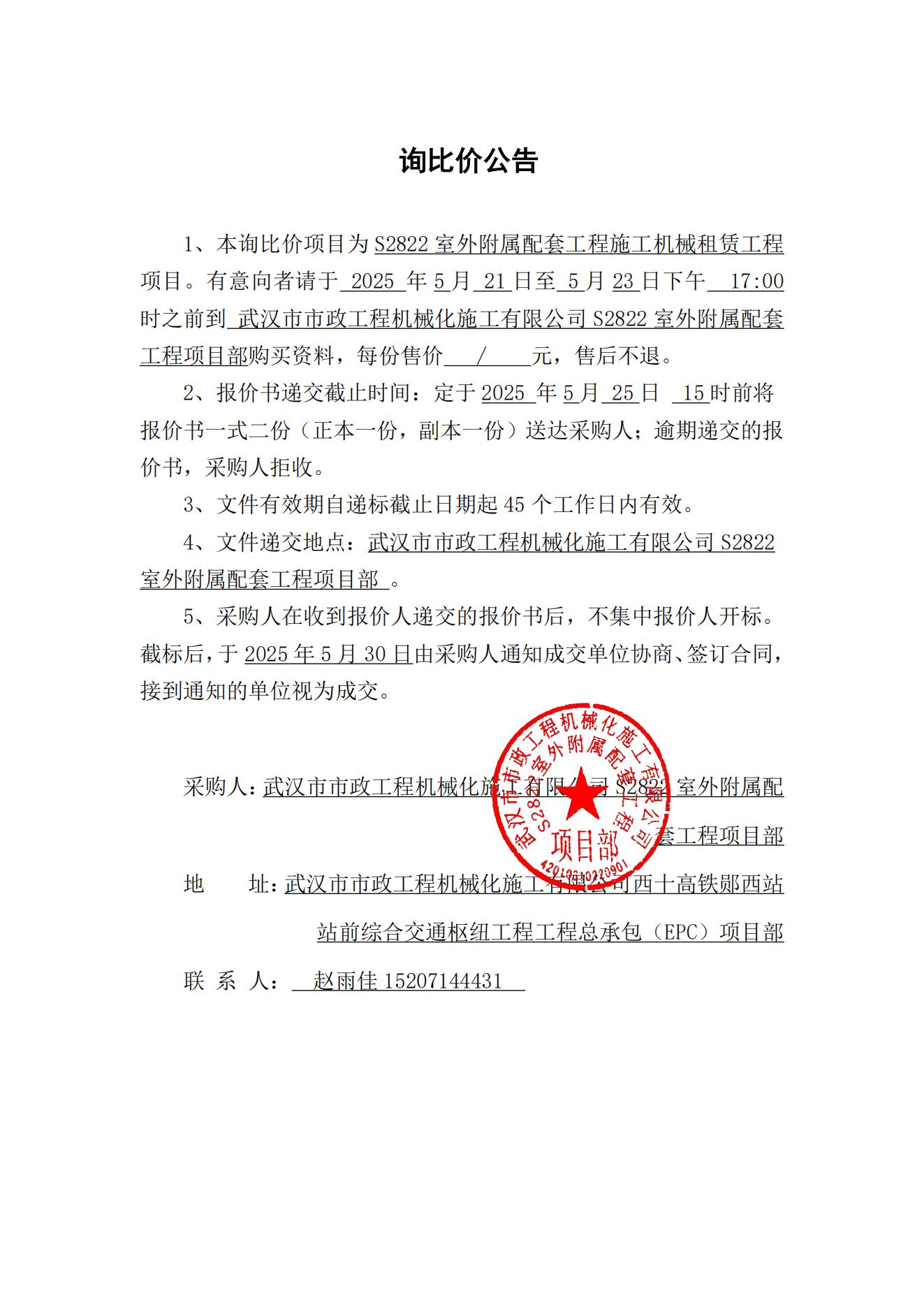S2822室外附屬配套工程施工機(jī)械租賃工程詢價(jià)公告