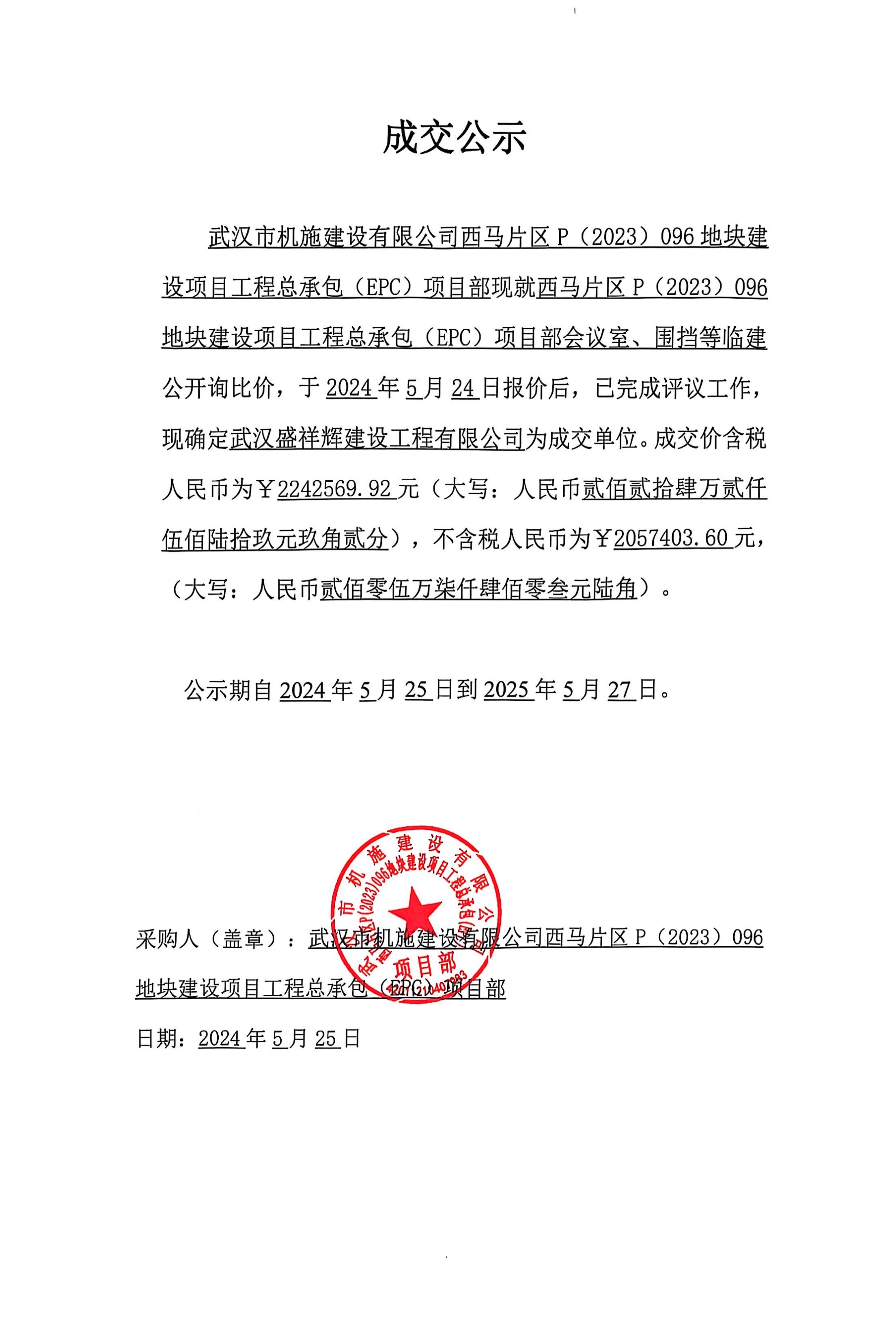 武漢市機(jī)施建設(shè)有限公司西馬片區(qū) P(2023)096 地塊建設(shè)項目工程總承包(EPC)項目部會議室、圍擋等臨建成交公示