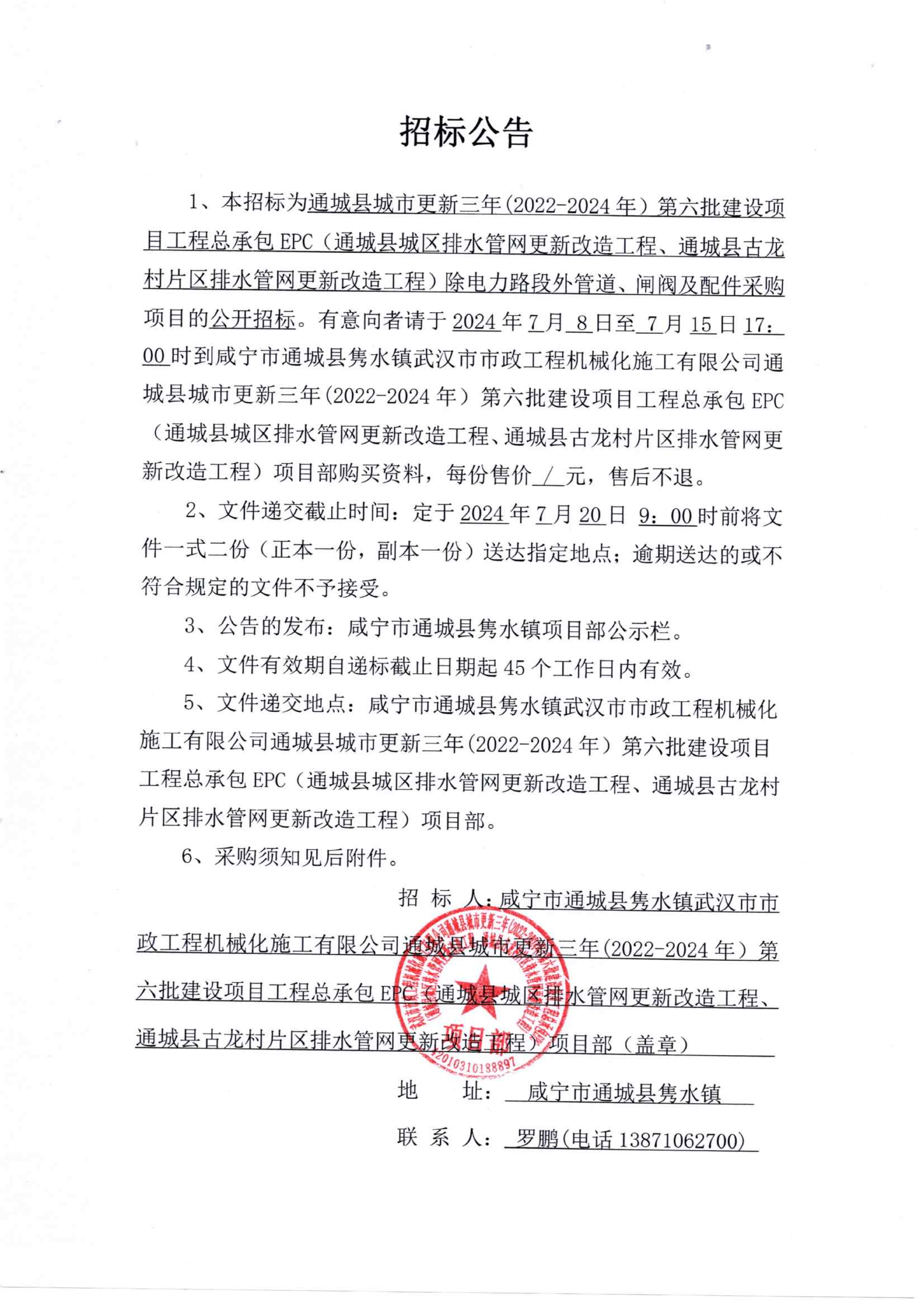 通城縣城市更新三年(2022-2024年)第六批建設(shè)項(xiàng)目工程總承包EPC(通城縣城區(qū)排水管網(wǎng)更新改造工程、通城縣古龍村片區(qū)排水管網(wǎng)更新改造工程)除電力路段外管道、閘閥及配件采購招標(biāo)公告