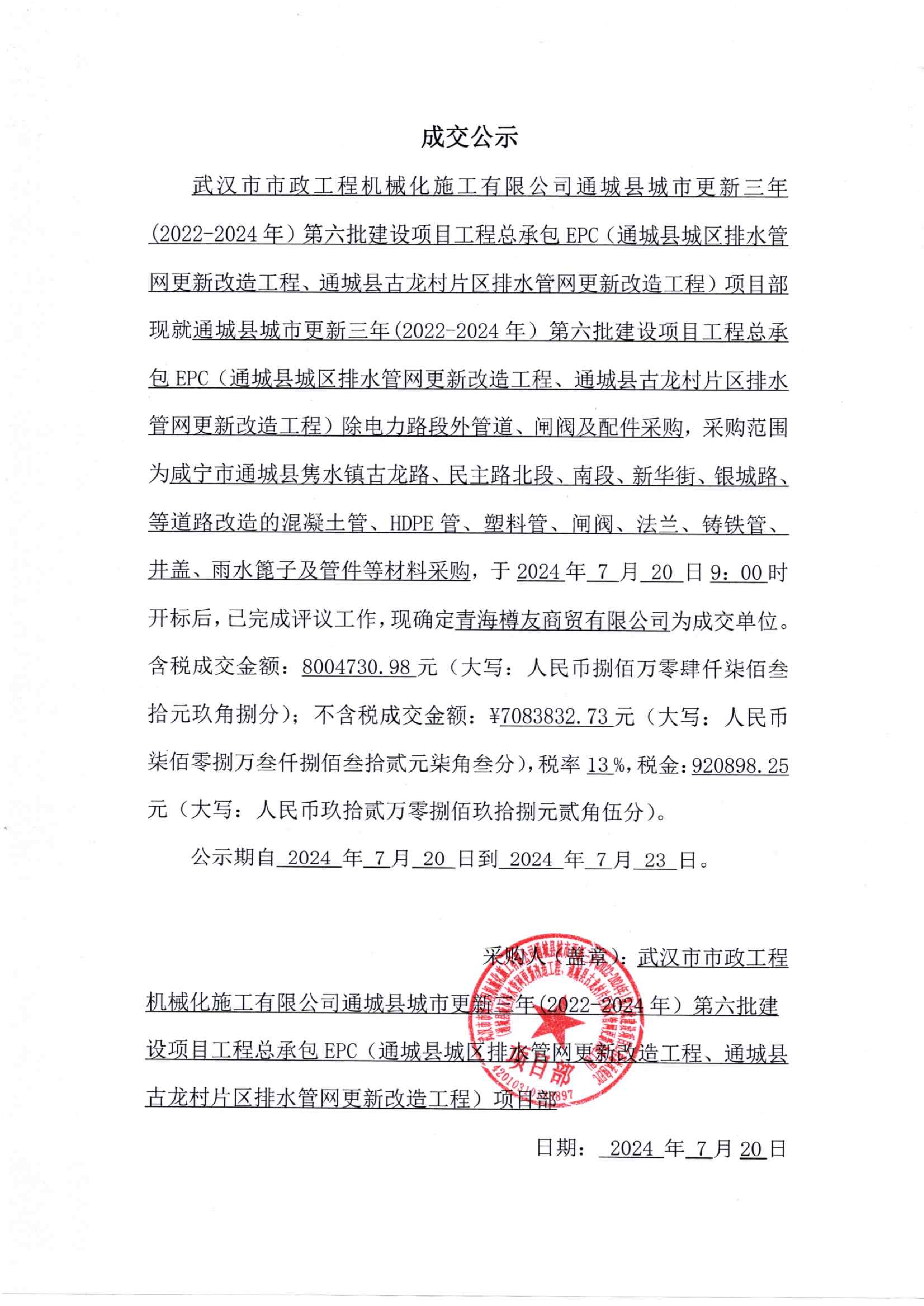 通城縣城市更新三年(2022-2024年)第六批建設項目工程總承包EPC(通城縣城區(qū)排水管網(wǎng)更新改造工程、通城縣古龍村片區(qū)排水管網(wǎng)更新改造工程)除電力路段外管道、閘閥及配件采購成交公示