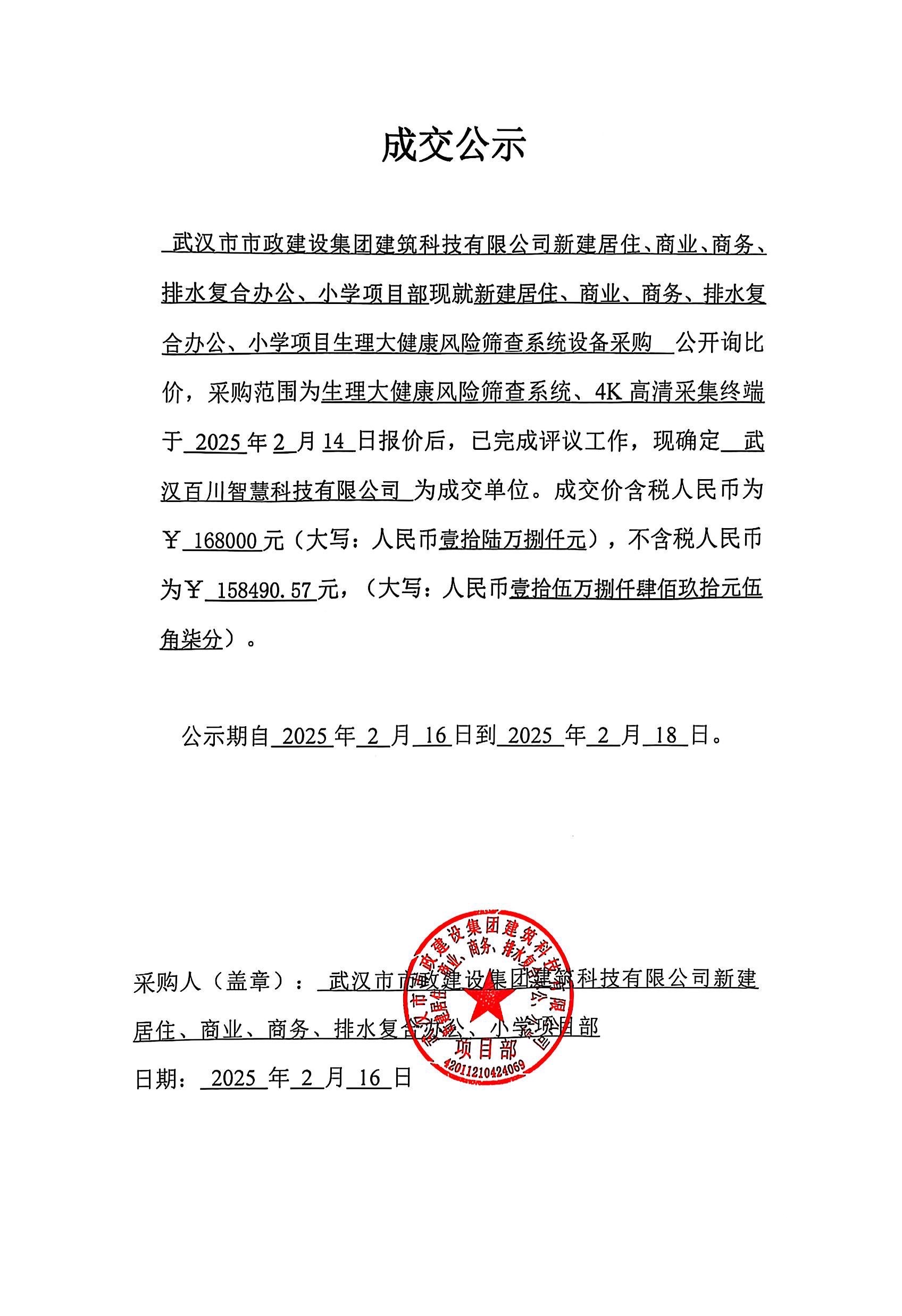 武漢市市政建設(shè)集團(tuán)建筑科技有限公司新建居住、商業(yè)、商務(wù)、排水復(fù)合辦公、小學(xué)項目生理大健康風(fēng)險篩查系統(tǒng)設(shè)備采購成交公示
