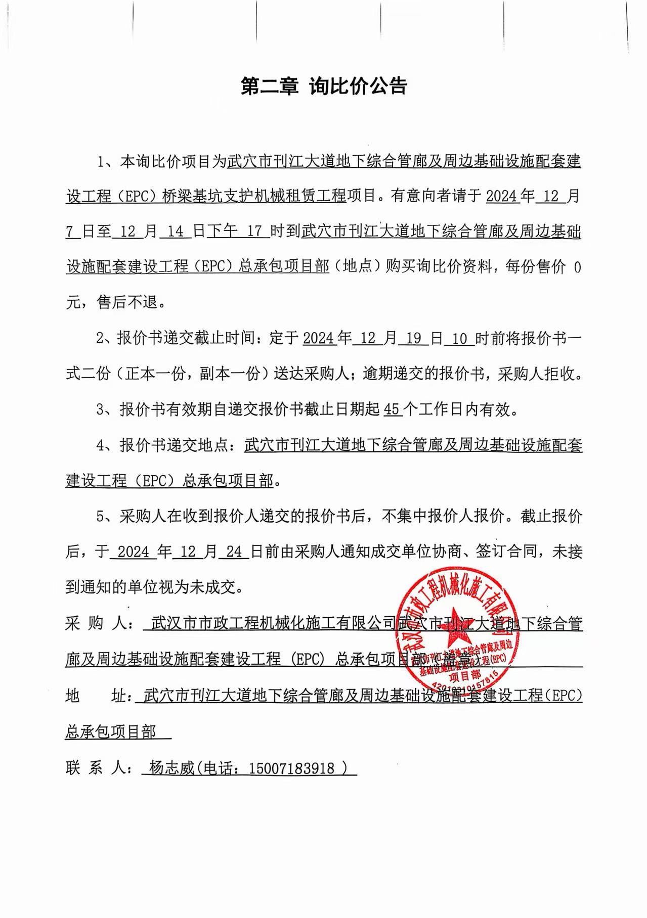 武穴市刊江大道地下綜合管廊及周邊基礎(chǔ)設(shè)施配套建設(shè)工程(EPC)橋梁基坑支護(hù)機(jī)械租賃工程詢價公告